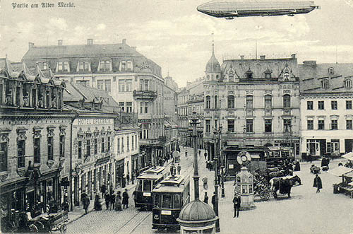 Der Überflug des Zeppelins "Sachsen" 1914 war Anlass ihn in allerlei Postkarten hineinzumontieren. Hier war es eine Karte vom alten Markt an der Ecke zur Hauptstraße.